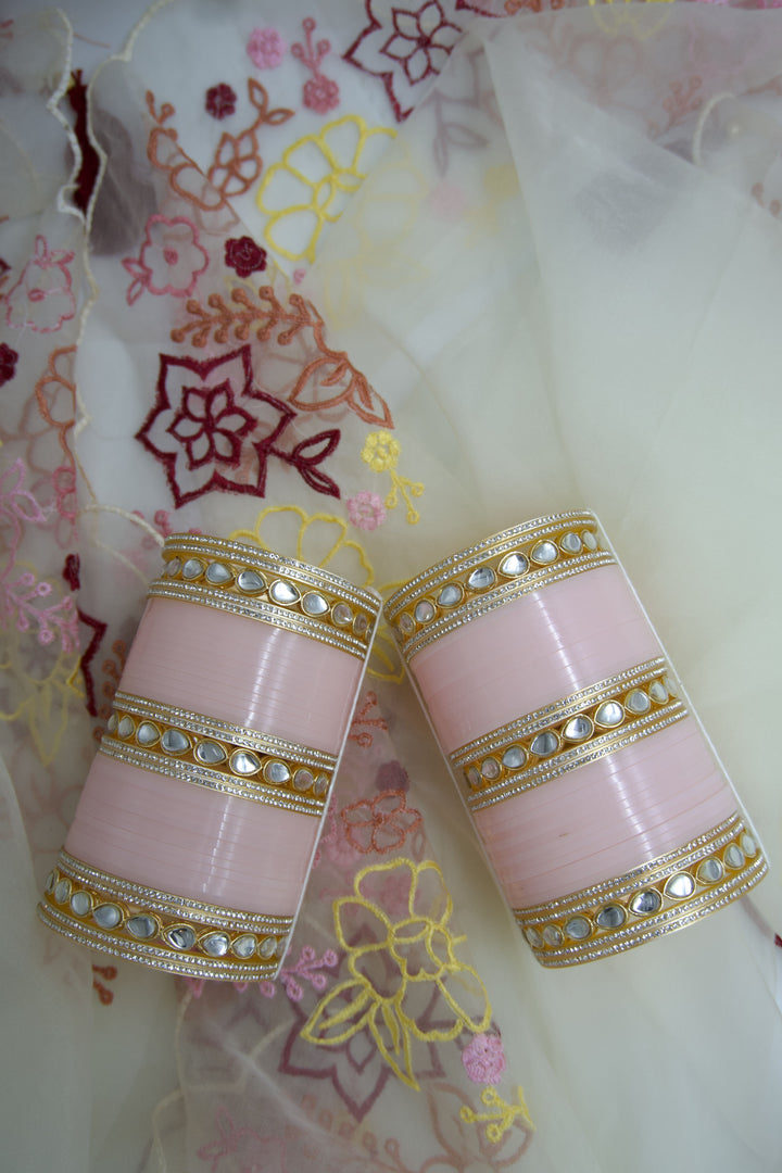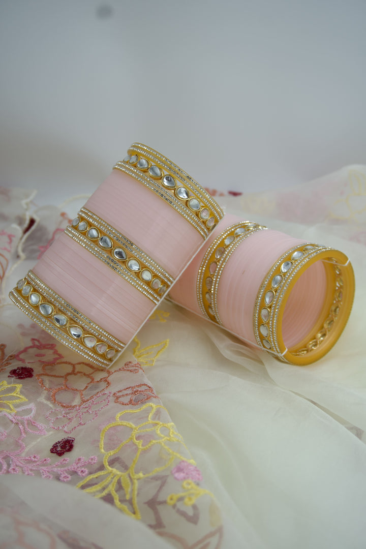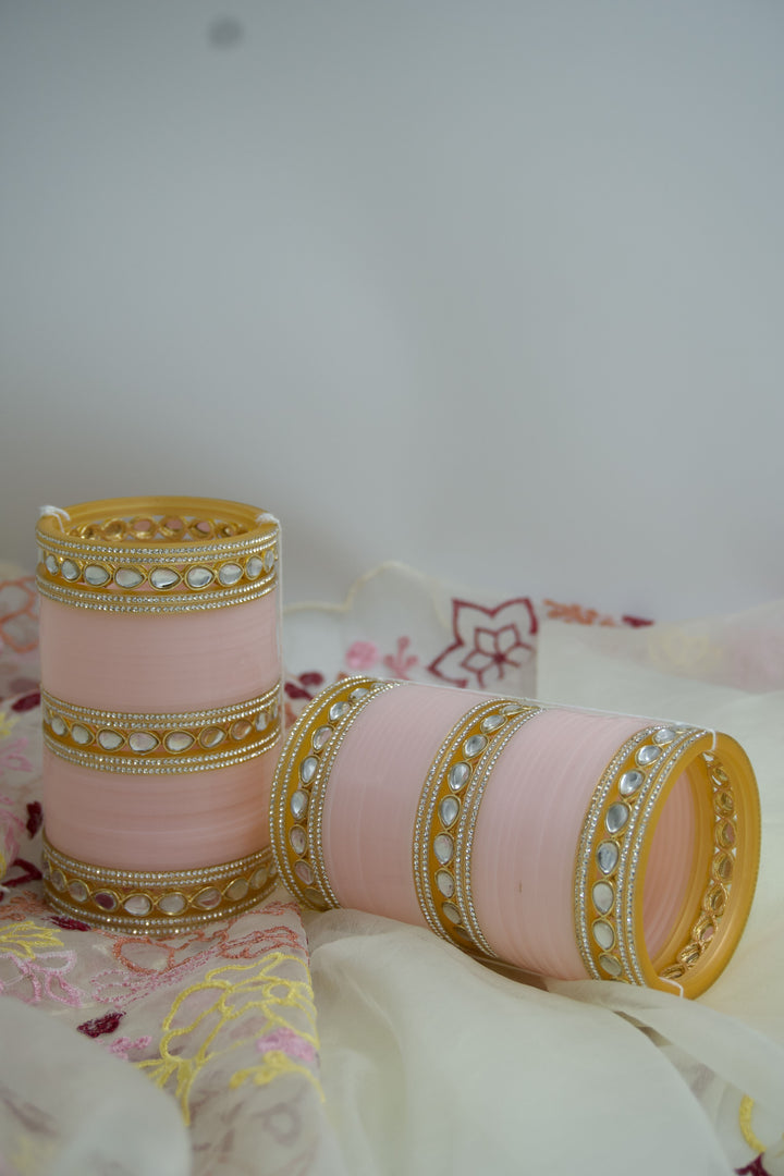 Gulabi Swarn Chura - Elegant Light Pink Bridal Bangles with Golden Accents