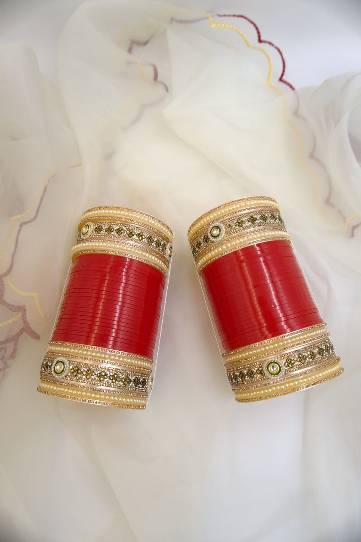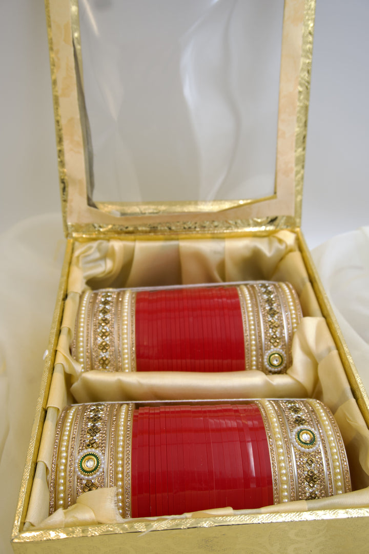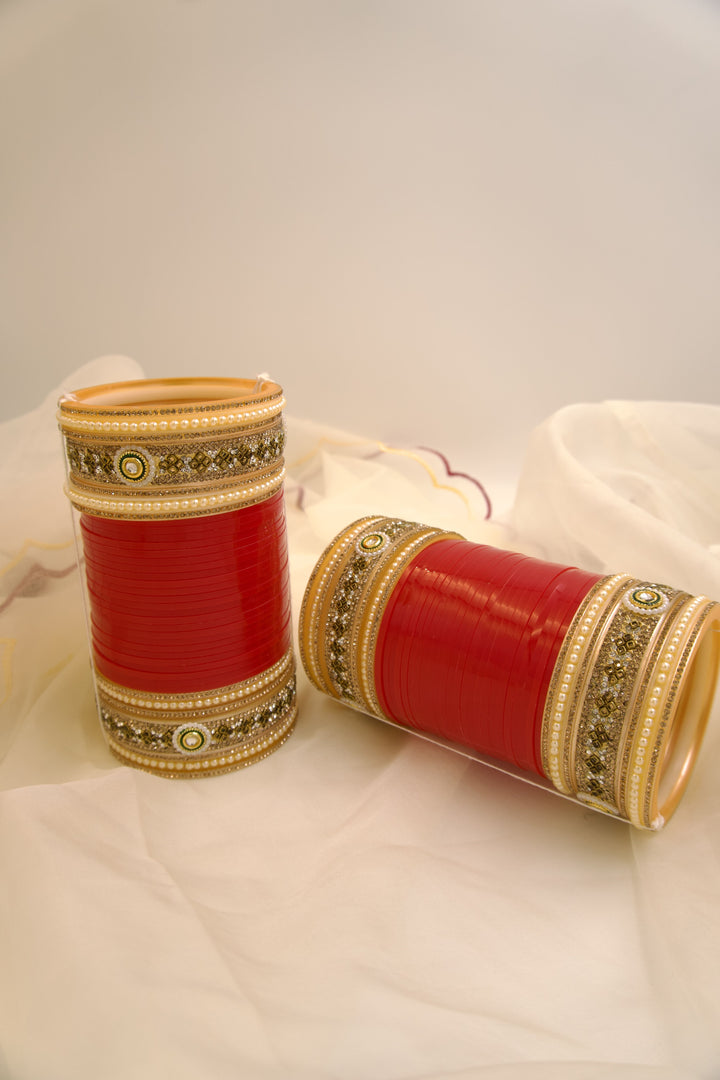 With a vibrant red base adorned with subtle gold accents, this chura exudes a classic charm that is both captivating and sophisticated.