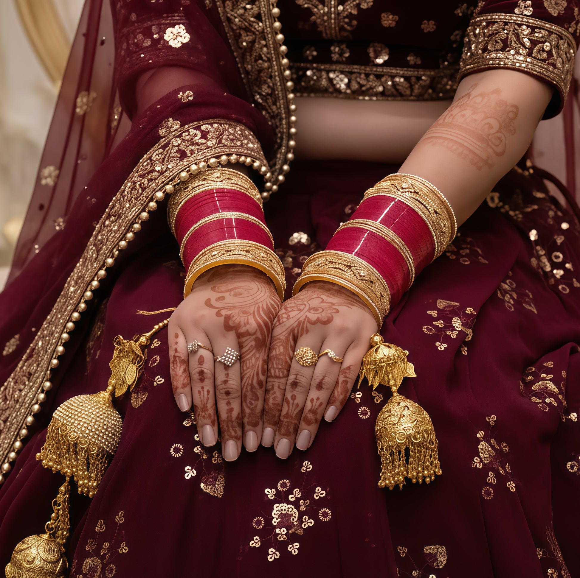 The Swarna Sindoor Chura is a luxurious addition to any bridal ensemble, designed to captivate with its radiant beauty. This Indian bridal chura, featuring exquisite AD (American Diamond) bangles, effortlessly blends tradition with modern elegance. The reddish-golden hue of the bangles symbolizes prosperity and warmth, making it an ideal choice for brides who want to make a bold statement on their special day.
